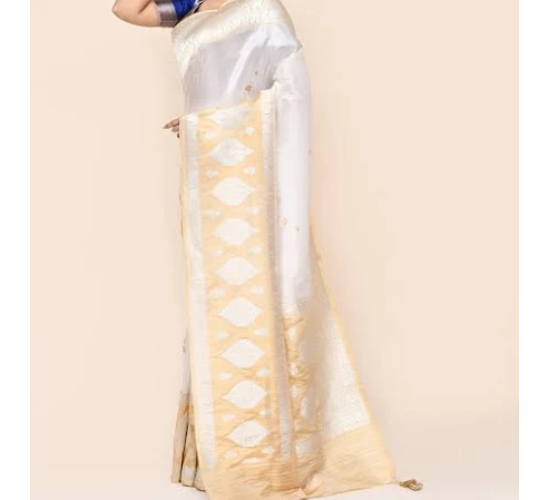 The VIRASAT Banarasi Tissue Silk Saree features lightweight tissue silk with a rich Banarasi weave and elegant zari detailing. Known for its subtle shine and graceful drape, it is perfect for weddings, festive occasions, and special celebrations. A timeless saree that blends traditional heritage with refined luxury and sophistication.